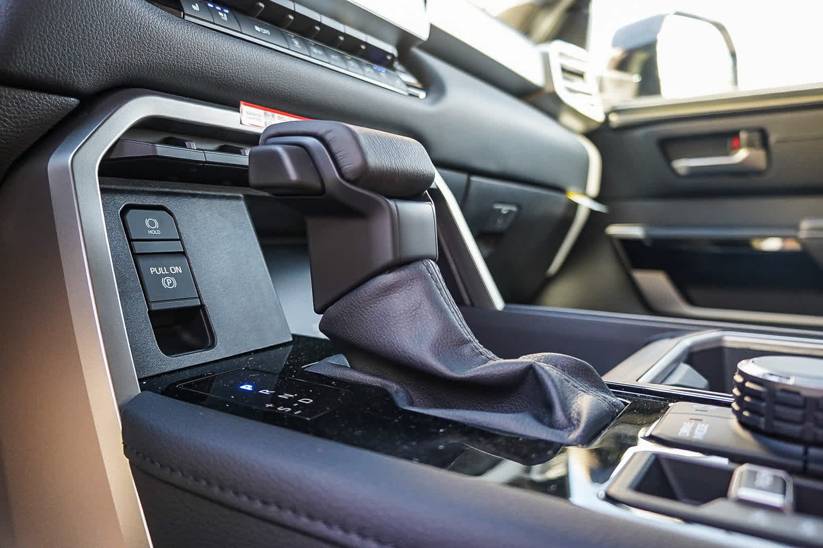 - Pomo de la palanca de cambios forrado en cuero TRD