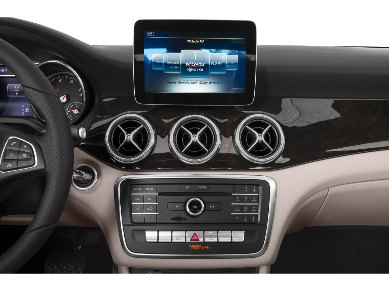 - Radio con búsqueda y exploración, reproductor de MP3, reloj, control de volumen con compensación de velocidad, toma de entrada de audio auxiliar, controles en el volante, activación por voz, sistema de datos de radio y control de memoria externa mbrace2.