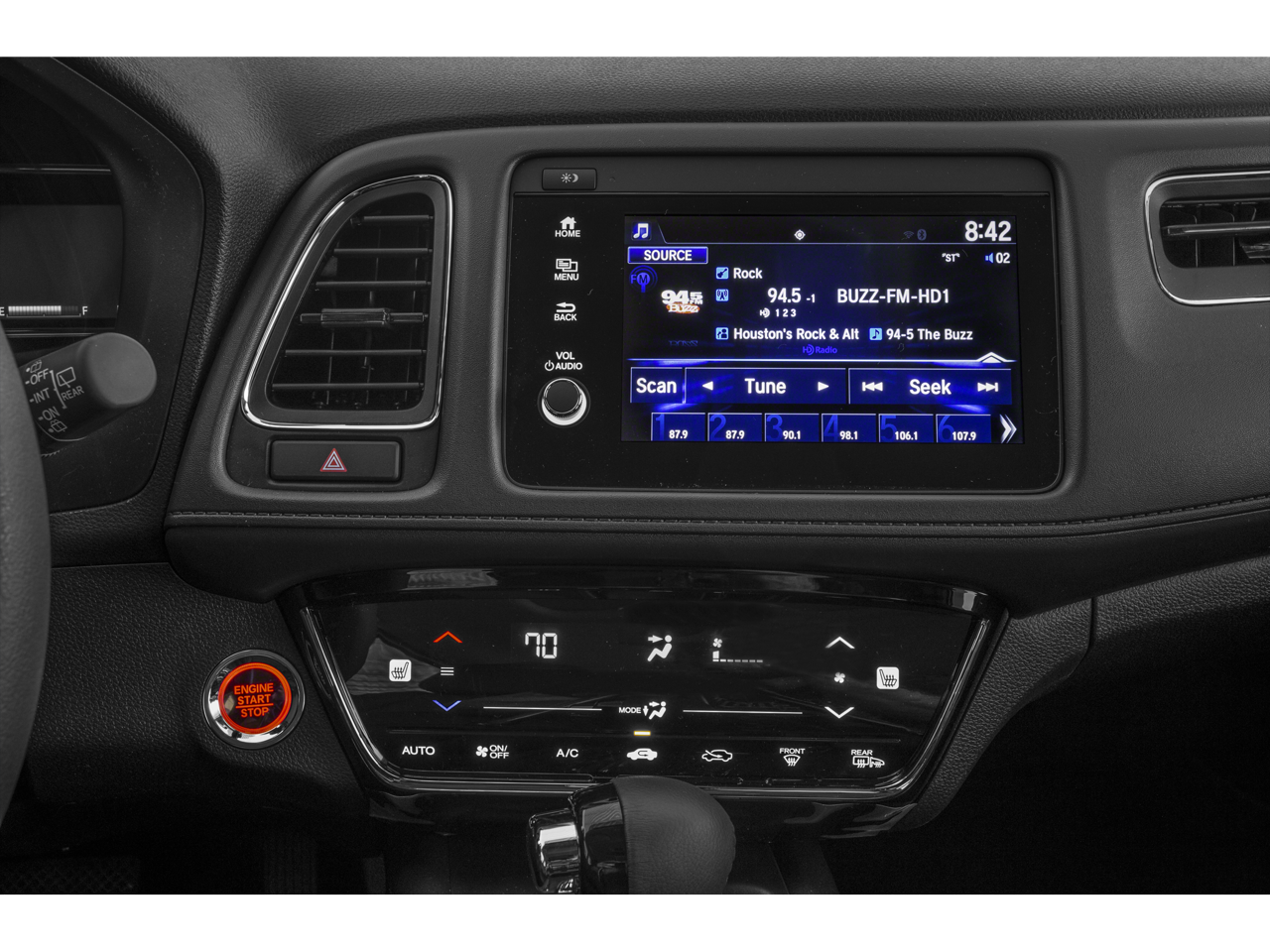 - Radio: Sistema de audio AM/FM/HD (180 vatios) —incluye: 6 altavoces, pantalla de audio de 7 pulgadas con pantalla táctil electrostática de alta resolución y ajustes personalizables, Bluetooth® HandsFreeLink y transmisión de audio, Sistema de datos de radio (RDS), compensación de volumen sensible a la velocidad (SVC), 1 interfaz de audio USB frontal de 1,0 A, 1 interfaz USB frontal de 1,5 A para smartphone/audio, integración con Apple CarPlay, integración con Android Auto, HondaLink, compatibilidad con Pandora y función de mensajes de texto SMS